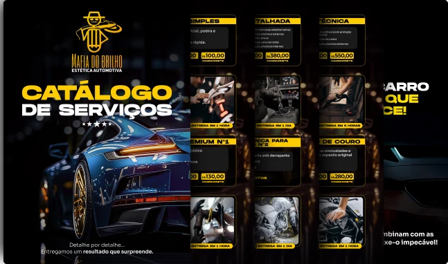 Sua estética automotiva merece um catálogo de serviços à altura: moderno, editável e atrativo.